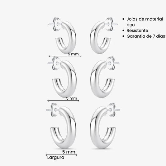 O Brinco Trio de Argolas Aço Redonda é uma peça moderna e sofisticada, marcada por seu design clássico em três tamanhos de argolas redondas e acabamento elegante. Com visual atemporal...