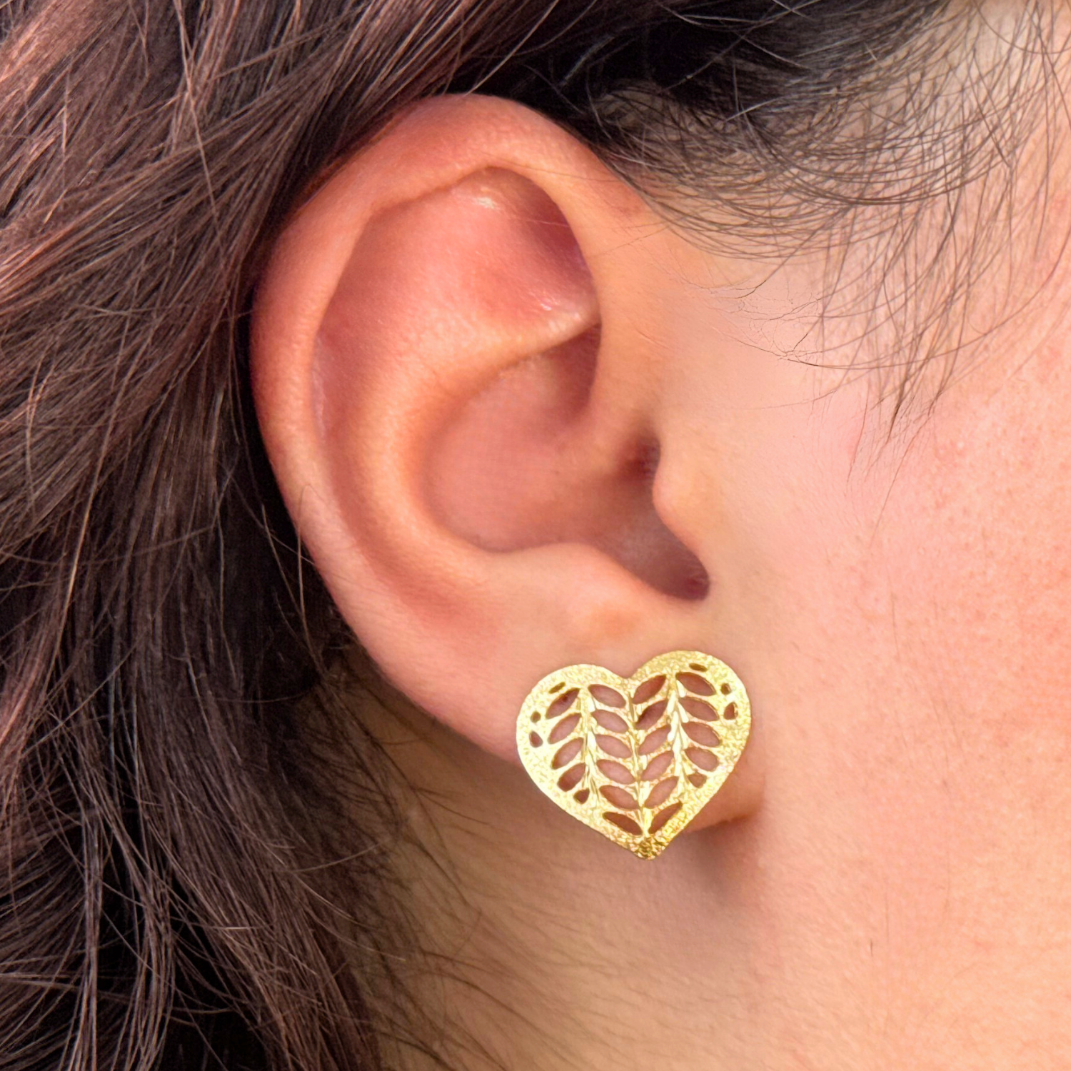 O Brinco Coração Folhas Vazadas folheado a ouro 18k, é a escolha perfeita para quem valoriza delicadeza com um toque de natureza e romantismo. Seu design combina a forma clássica do coração com detalhes vazados em folhas, criando uma peça leve, charmosa e cheia de significado. Com acabamento texturizado e brilho sutil, ele é ideal para complementar o visual com elegância e suavidade. O fecho com tarraxa garante conforto e segurança ao usar.