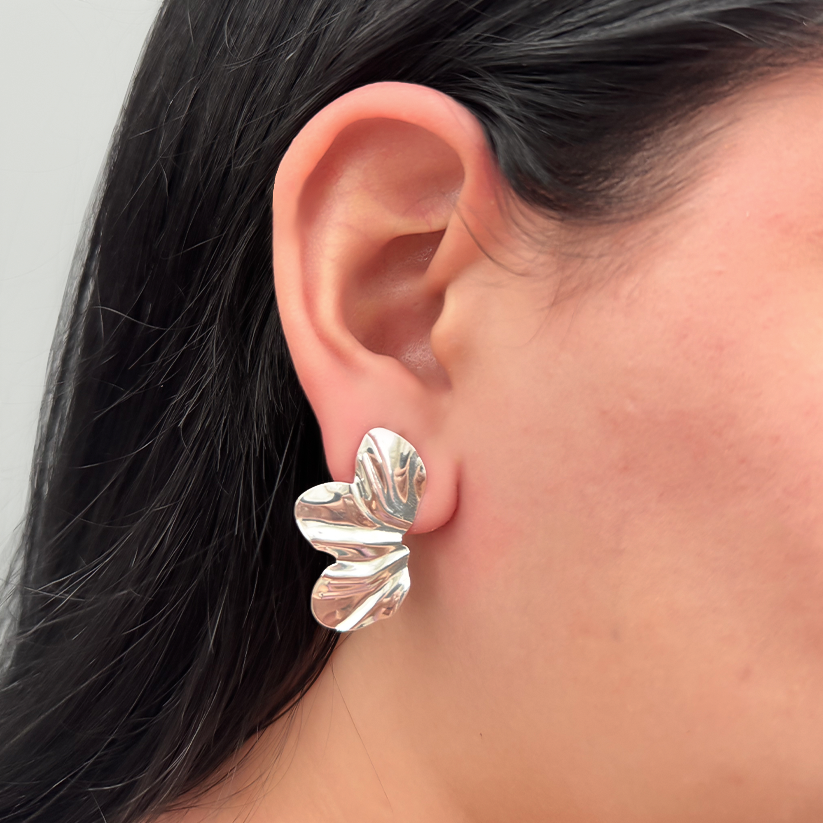 Composto por formas que remetem a pétalas ou folhas, este brinco apresenta um design orgânico e tridimensional, com curvas suaves e um acabamento polido que reflete a luz de forma delicada. A fluidez das formas cria um visual dinâmico e artístico, ideal para quem aprecia a beleza da natureza em acessórios.
