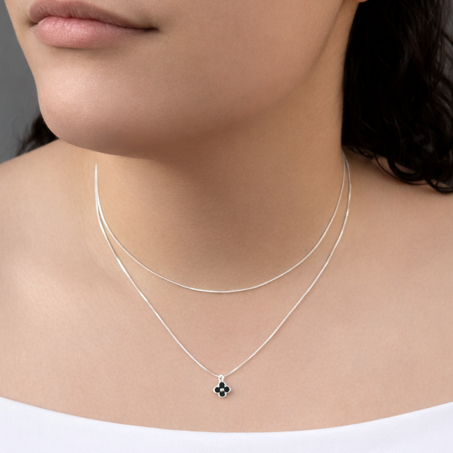 O Colar Duplo Trevo Preto Folheado a Prata, é ideal para quem busca um acessório marcante e versátil. Seu design duplo, confere um toque moderno e cheio de estilo ao visual. Moderno e elegante, pode ser usado sozinho para realce imediato ou em composições, garantindo sofisticação e personalidade em qualquer produção.