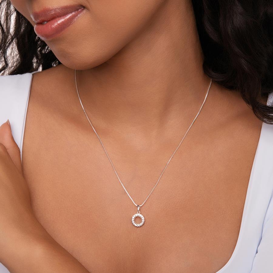 O pingente em formato de círculo, delicadamente cravejado com zircônias, simboliza a eternidade e a perfeição. Um visual clássico que nunca sai de moda, ideal para quem busca sofisticação e um toque de luz.