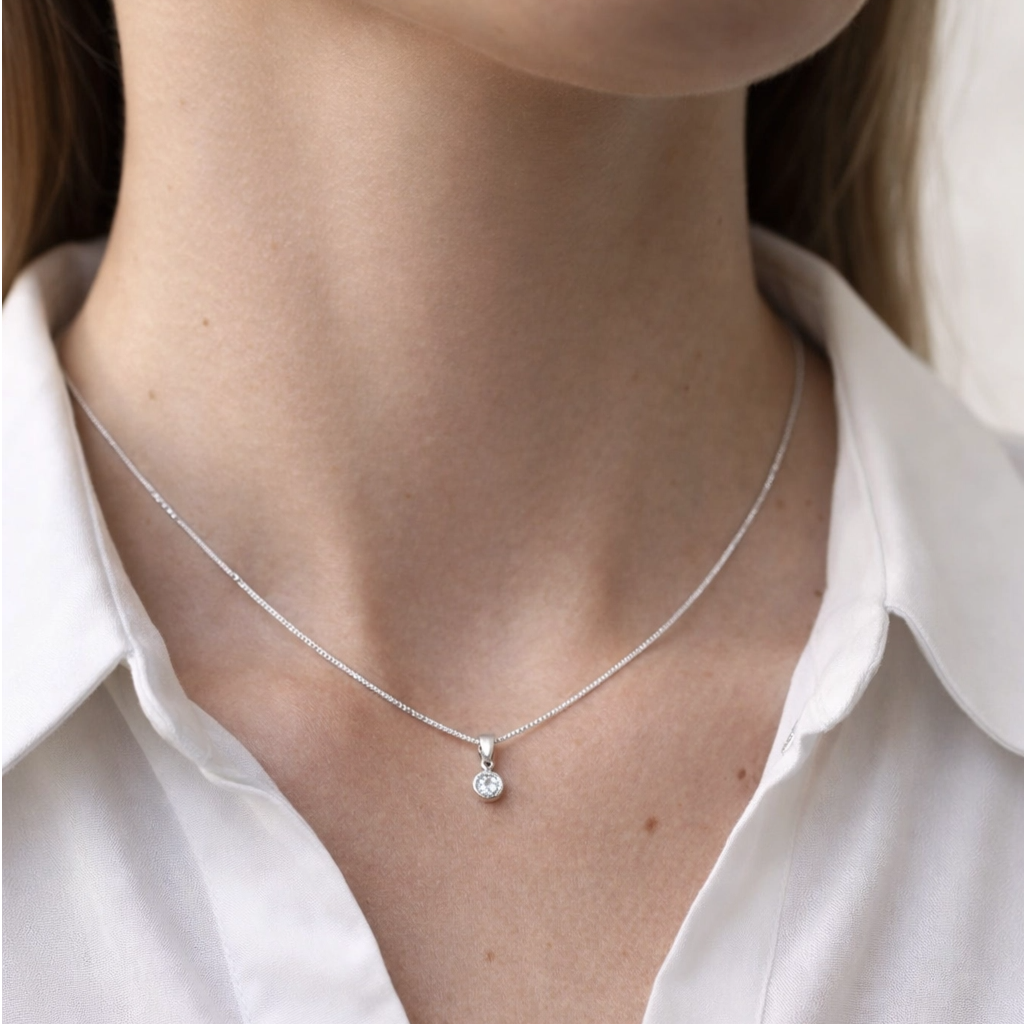 O ponto de luz traz brilho na medida certa, enquanto a borda adiciona um acabamento mais sofisticado e moderno à peça. No look, ele ilumina o colo de forma sutil, combinando perfeitamente com produções minimalistas, sociais ou até com composições em camadas para um visual mais atual.
