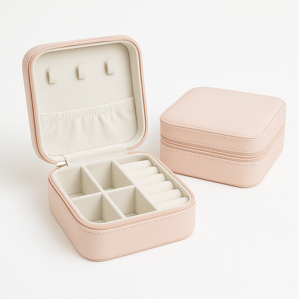 Nosso Porta Jóias vai como brinde para todas as compras realizadas em nosso site no valor acima de R$300,00 reias. Sua cor é rosa pastel, onde possui um amplo espaço para guardar suas semijóias tendo compartimento para brincos, anéis, pulseiras, colares, enfim o que você quiser. E o melhor que ele é portátil, podendo levar consigo para todo lugar.
