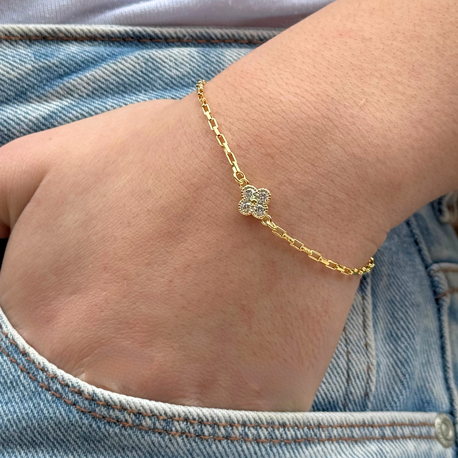 A Pulseira Elo Quadrado Trevo de Cristal Folheado a Ouro 18k, é uma joia que combina a delicadeza do trevo com o brilho sutil dos cristais, criando uma peça única e encantadora. Perfeita para adicionar um toque de sofisticação e sorte ao seu dia a dia ou para complementar looks mais elegantes.